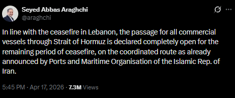 The increase in confidence followed statements from Seyed Abbas Araghchi, who announced that commercial vessel traffic through the Strait had been declared fully open for the duration of the ceasefire. According to the announcement, ships are permitted to travel along coordinated maritime routes approved by Iran’s Ports and Maritime Organization.