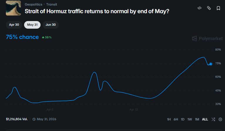 Trading activity on the prediction platform Polymarket shows growing confidence that shipping activity through the Strait of Hormuz will return to normal by the end of May 2026. Market participants pushed the probability of normalization to 74%, after briefly reaching a high of 82% following confirmation that the waterway had reopened during a ceasefire period.
