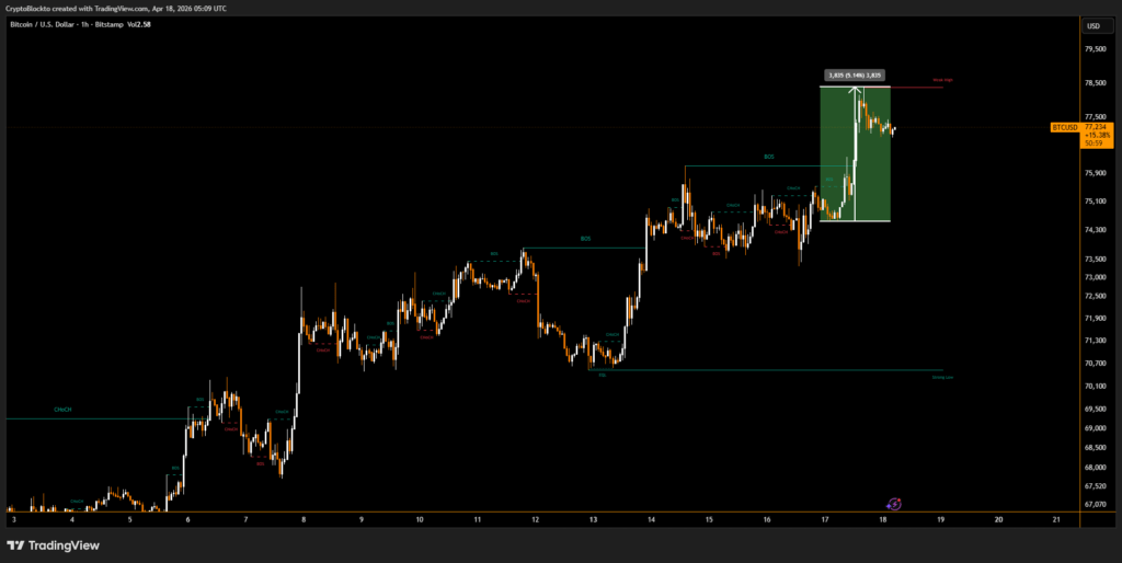 The reopening news triggered reactions across financial markets. The price of Bitcoin climbed sharply, briefly reaching $78,000 before stabilizing near $77,358 at the time of reporting. Analysts noted that geopolitical developments linked to Iran significantly influenced both digital assets and energy markets.