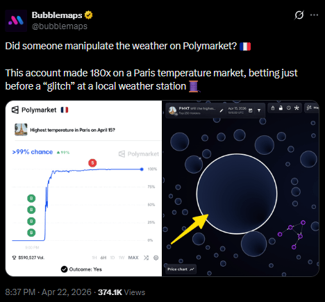Blockchain analytics firm Bubblemaps identified a similar anomaly on April 15, when the temperature held near 18°C for most of the day before abruptly jumping to 22°C and then falling again. Analysts noted that shortly before the spike, one trader purchased NO shares on “18°C”, later exiting the position with profits exceeding $21,000.