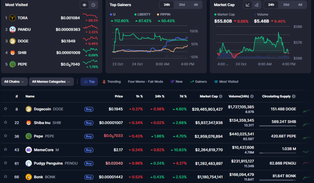 According to CoinMarketCap, the global memecoin market capitalization has fallen over 21% in the past 30 days, as the October market correction triggered large-scale liquidations across leveraged crypto positions.