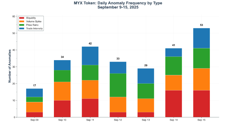 On Sept. 9, MYX liquidity anomalies spiked by 433% on the Gate exchange, with 32 illiquidity events recorded over just two days. During these periods, average trade sizes dropped 67%, while trading frequency declined 45%.