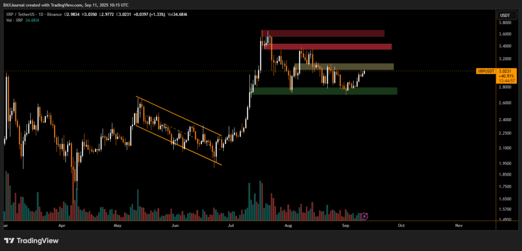 The daily chart highlights that XRP recently bounced from a green demand zone between $2.75 and $2.85, where buyers consistently entered the market. This area has become a key support level for the asset.