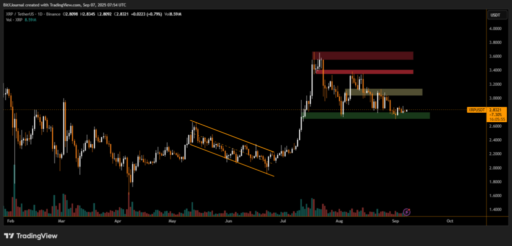 Ripple’s XRP is currently trading under pressure, hovering near $2.83 after failing to sustain its July breakout. The chart indicates that while long-term optimism remains, near-term technicals show strong resistance and limited bullish momentum.