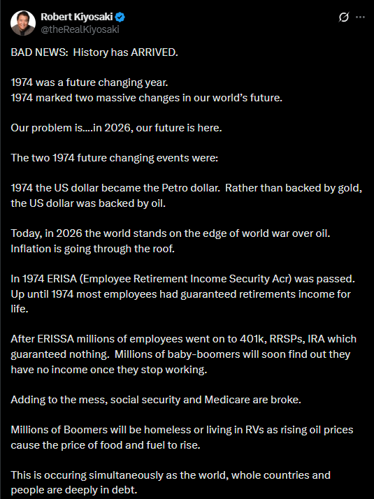 Kiyosaki pointed to the United States’ transition toward a petrodollar framework and the passage of the Employee Retirement Income Security Act as key developments that changed how pensions and retirement savings function. He argued that guaranteed lifetime income systems gradually gave way to market-based savings plans such as 401(k) accounts, placing greater financial responsibility on individuals. He warned that millions of baby boomers may face income challenges once they retire.