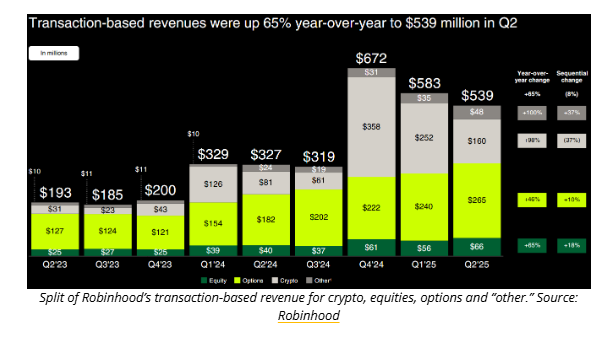 The breakdown of transaction-based revenues shows crypto as one of the fastest-growing verticals, outpacing traditional asset classes like equities and options.
