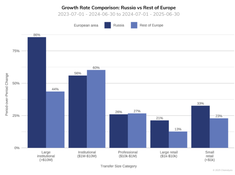 Large transactions exceeding $10 million rose 86% year-over-year, nearly doubling the growth rate of other European regions. “The scale of institutional activity is particularly notable,” the report added, pointing to evidence that Russia’s financial entities are increasingly experimenting with blockchain-based financial infrastructure.
