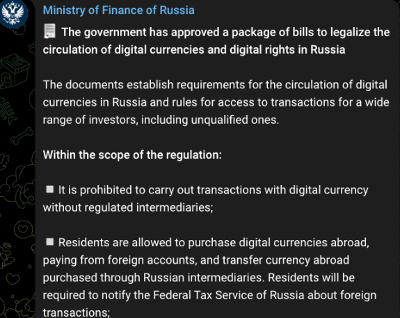 Russia’s government has approved a package of draft bills aimed at channeling domestic crypto trading through licensed intermediaries while tightening state oversight. The Finance Ministry confirmed that transactions involving digital currencies without regulated intermediaries would be prohibited under the new framework.