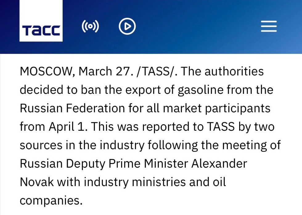 Russia plans to introduce a nationwide ban on gasoline exports starting April 1, following instructions from Deputy Prime Minister Alexander Novak to the energy ministry to prepare the necessary resolution. According to officials, the restrictions are expected to remain in place until July 31 and will apply to all market participants, expanding earlier limits that targeted only non-producers.