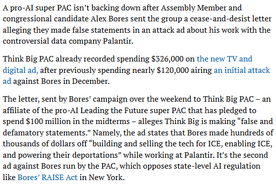 The mailers criticize Bores’ campaign financing and frame him as disconnected from constituents, stating that “Bankman-Fried’s buddies are bankrolling Bores for Congress.” Think Big PAC backs candidates aligned with pro-technology policies and AI innovation, and it has spent hundreds of thousands of dollars on digital and television ads targeting Bores, including references to his past work at Palantir.