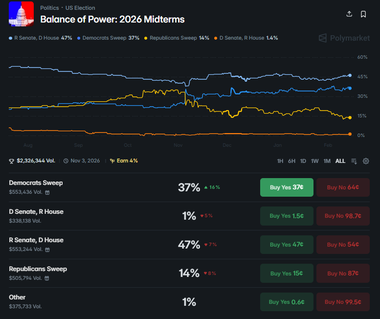 However, the narrow majority in the US House of Representatives and shifting midterm projections have added urgency to negotiations. Prediction markets currently indicate a strong possibility of split congressional control in 2026, increasing the risk that pending crypto legislation could stall.