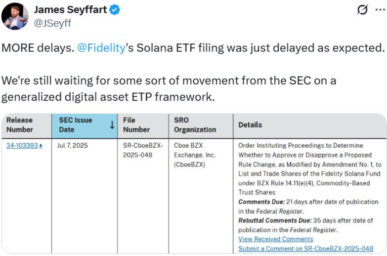 In contrast to the Truth Social filing, the SEC has again delayed its decision on Fidelity’s proposed spot Solana (SOL) ETF. The delay opens a new public comment period, with responses due within 21 days and rebuttals within 35 days.