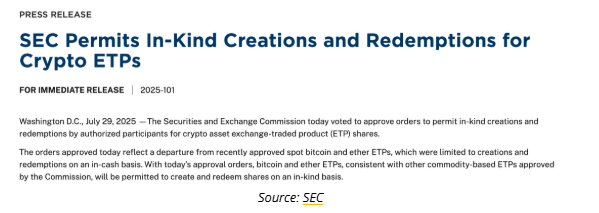 On July 29, the SEC gave green light to accelerated approvals for major exchanges—including Nasdaq, NYSE Arca, and Cboe BZX—to permit in-kind transactions for ETFs holding spot Bitcoin and Ethereum. This approval includes industry giants like BlackRock, Fidelity, VanEck, and Ark21, whose crypto ETFs can now exchange underlying crypto assets without liquidating to cash.