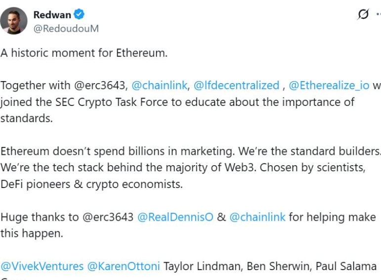 According to ERC-3643 Association president Dennis O’Connell, the SEC demonstrated a clear change in attitude. “The task force was very welcoming, engaged, and motivated to bring the U.S. into leadership,” he said. O’Connell emphasized that the SEC had not previously considered how open technical standards could be pivotal in bridging blockchain and regulatory needs.