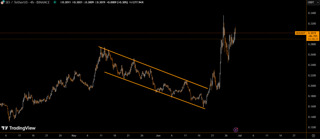 At the time of writing, SEI trades at $0.29, just below the key psychological resistance of $0.30. The rally appears to be fueled by growing investor interest in alternative layer-1 chains, as well as a spike in on-chain activity.