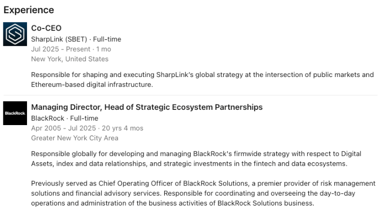 Sharplink had previously named Ethereum co-founder Joseph Lubin as its board chairman, signaling long-term alignment with Ethereum’s ecosystem. Now, the hiring of Chalom — who helped BlackRock become the world’s largest crypto ETF issuer with $95.7B in assets — sends a clear message: Sharplink intends to compete at the highest level.