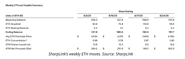 SharpLink also introduced a new metric called “ETH Concentration,” which measures ETH holdings per 1,000 assumed diluted shares. This figure now exceeds 4.0, more than doubling since June. Additionally, the firm reported staking rewards of 1,799 ETH, boosting its passive income while strengthening its treasury.