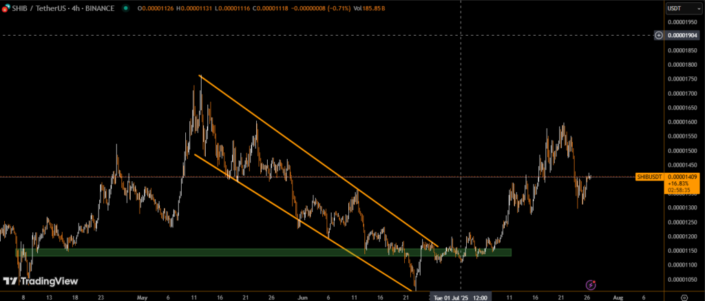 The Shiba Inu (SHIB) price showed moderate movement on July 26, registering a 5% gain over the past 24 hours, yet remaining within a tightly bound trading range. With both bulls and bears showing restraint, the token continues a period of sideways consolidation—raising the question of how long this phase could last.