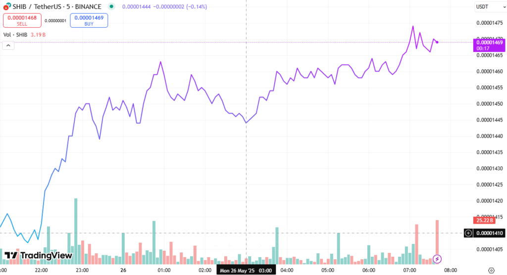 In the final trading hour, SHIB’s price swung between $0.00001453 and $0.00001463, before settling back to $0.00001457 under modest selling pressure.