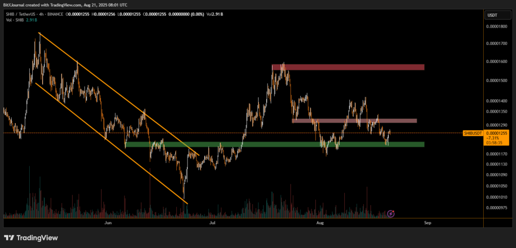 Shiba Inu (SHIB) witnessed heightened market activity this week, as trading volume surged past 1 trillion tokens, marking one of the largest daily spikes in recent weeks. Despite a sharp intraday spread of nearly 5%, bulls managed to defend critical dual support levels, keeping the asset from sliding further.