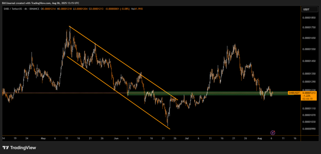 The week began with a steep retracement from $0.000012362 down to $0.000011985, reflecting broader market caution and investor risk-off behavior. However, SHIB managed to stabilize above the $0.000012000 support threshold, consolidating gains before making a slow but steady push upward.