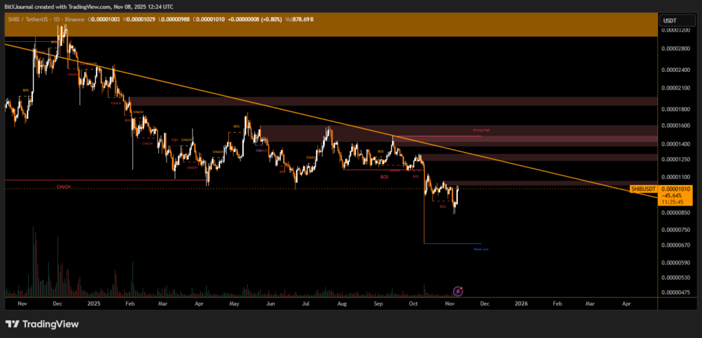 BitXJournal crypto market analyst commented, “Shiba Inu’s current price structure suggests a technical bottoming process. Sustaining above $0.0000100 could open the way toward the $0.0000115–$0.0000120 resistance area, but a rejection at the trendline may limit upside potential.”