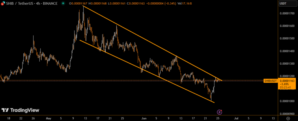 A key resistance level stands at $0.00001175. A decisive break above this could open the door to retest the June 16 high near $0.00001230.
