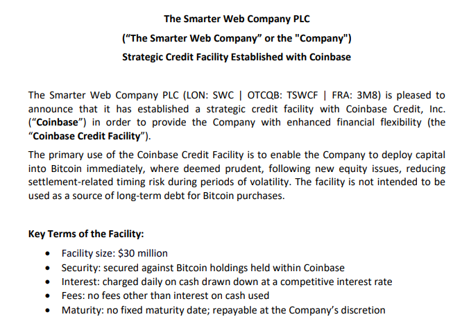 UK listed The Smarter Web Company has secured a $30 million Bitcoin backed credit facility from Coinbase Credit to accelerate Bitcoin acquisitions following equity fundraises. The facility is collateralized by Bitcoin held in custody with Coinbase.
