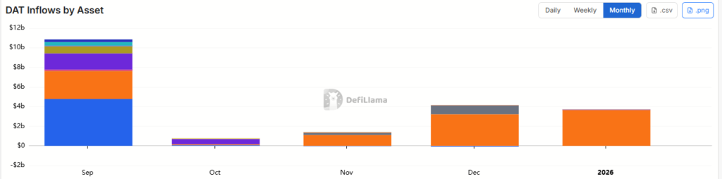 The move comes as digital asset treasury inflows have slowed. Data from DefiLlama shows inflows peaked at $4 billion in December and $3.7 billion in January before cooling sharply in February.