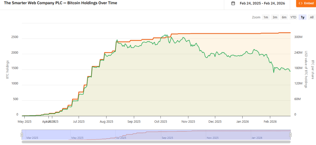 Smarter Web, listed on the London Stock Exchange’s Main Market and trading on the OTCQB in the US, currently holds 2,689 BTC at an average acquisition cost of $112,865 per coin. At current prices near $64,000, its treasury is valued at roughly $170 million, representing a significant unrealized drawdown.