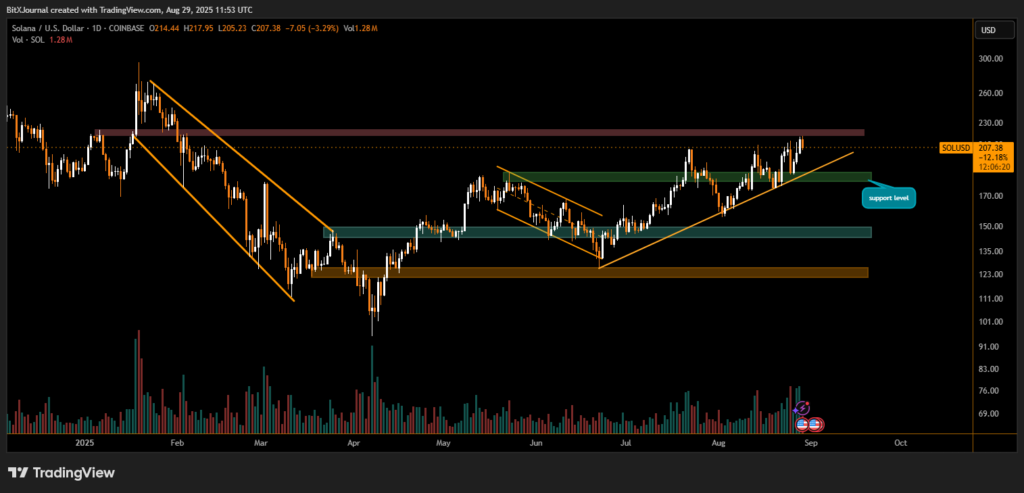 Solana (SOL) is trading at $207 after a recent rally that brought the price close to the $230 resistance zone, a level that has capped gains multiple times in 2025. Despite short-term selling pressure, the broader market structure suggests that buyers remain in control as long as the ascending trendline holds.