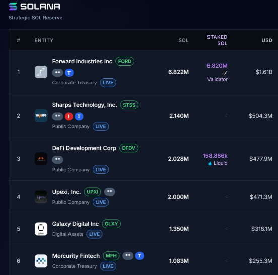 The largest corporate holder is Forward Industries, which controls more than 6.8 million SOL worth $1.61 billion. Other notable firms, including Sharps Technology, DeFi Development Corp., and Upexi, each maintain positions of around 2 million SOL, valued above $400 million per entity.