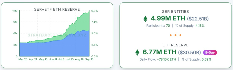 • Ethereum treasuries hold nearly 5 million ETH (about $22 billion), while ETFs control an additional 6.77 million ETH (valued at over $30 billion).