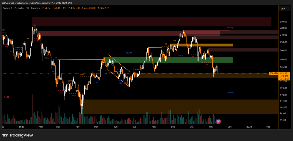 The technical setup on Solana’s daily chart shows a break of structure (BOS) below the $156 support level, a key threshold that had previously held through multiple tests in October. The breakdown coincided with increased selling volume, suggesting that short-term traders are taking profits ahead of potential volatility.