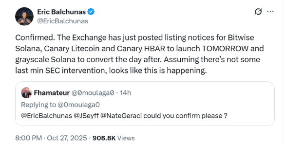 Bloomberg analyst Eric Balchunas confirmed that Bitwise’s Solana ETF will debut alongside Canary’s Litecoin and Hedera ETFs, further signaling a broadening institutional embrace of altcoins.