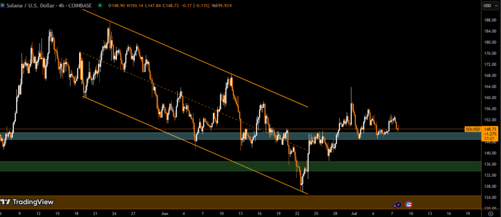 Despite this bullish on-chain data, SOL’s market price experienced short-term weakness, falling 1.45% over the past 24 hours. The token dropped from $151.41 to $149.21, briefly slipping below the critical $150 psychological support level. A sell-off between July 6 and July 7 created a $4.58 trading range, peaking at $153.67.