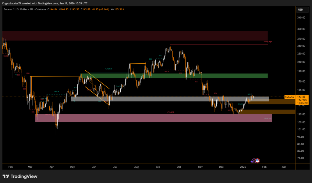 Solana (SOL) is trading near the $144 level, following a prolonged pullback from its prior highs. The market shows price stabilizing above a historical demand zone, an area that previously attracted strong buying interest. This suggests selling pressure is weakening after months of lower highs.