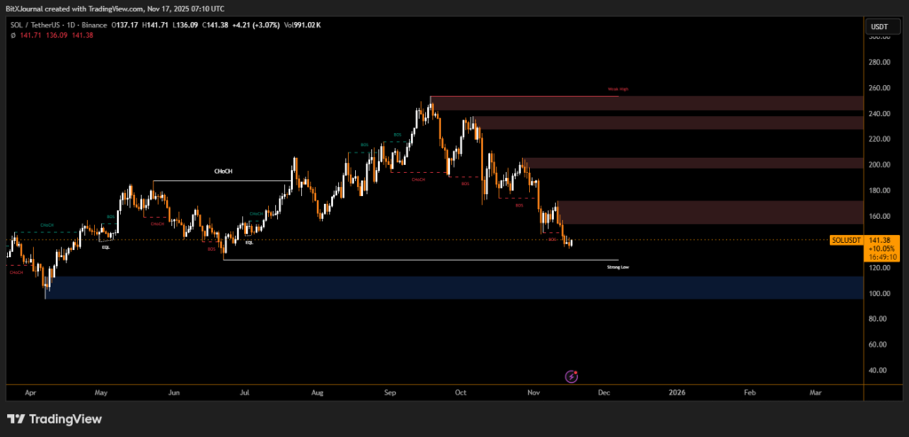 SOL’s immediate test remains the region beneath current price action, hovering above the underlined strong low support around $115–$125. A clean breakdown below this area could expose deeper liquidity pockets that haven’t been tested since early summer.