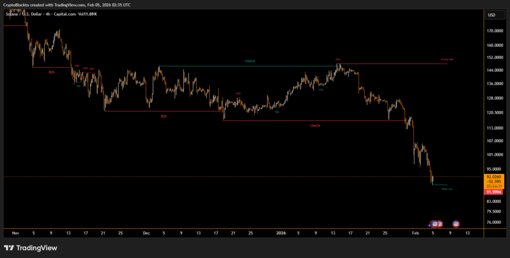 Solana extended losses with an additional 6% decline, deepening the broader crypto market pullback as traders moved away from risk assets amid heightened volatility. The latest drop pushed SOL toward fresh short-term lows, confirming sustained bearish momentum on lower timeframes.