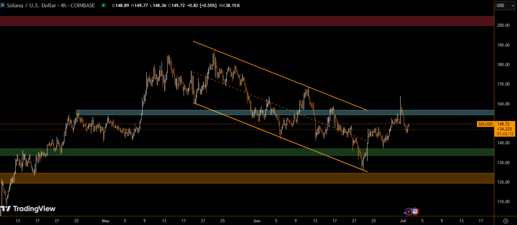 • SOL dropped $12.34 within 24 hours, with a price range spanning $157.42 to $145.08