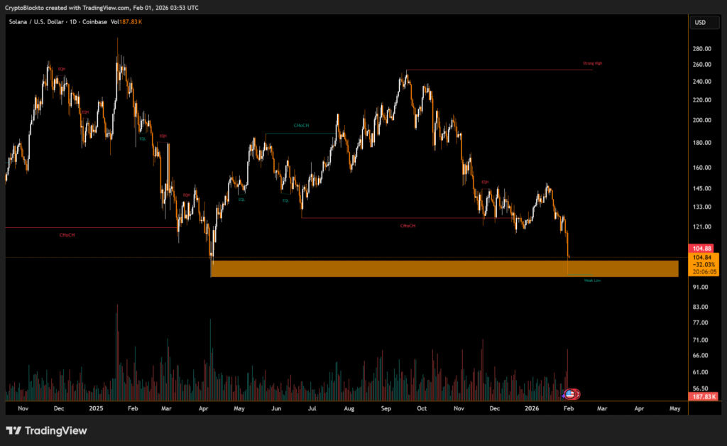 Solana’s price dropped sharply to the $95–$100 zone, marking its weakest level since April 2025 as a broad risk-off move swept across crypto, equities, and commodities. The decline came alongside sell-offs in bitcoin, AI-linked stocks, and gold, highlighting Solana’s growing sensitivity to macroeconomic and geopolitical stress.