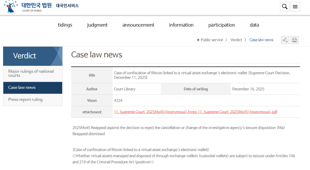 In January, South Korea’s Supreme Court ruled that Bitcoin held on centralized exchanges qualifies as an “object of seizure” under the Criminal Procedure Act. The decision affirmed that digital assets possess independent economic value and can be frozen if linked to criminal investigations, expanding authorities’ ability to confiscate cryptocurrency holdings.