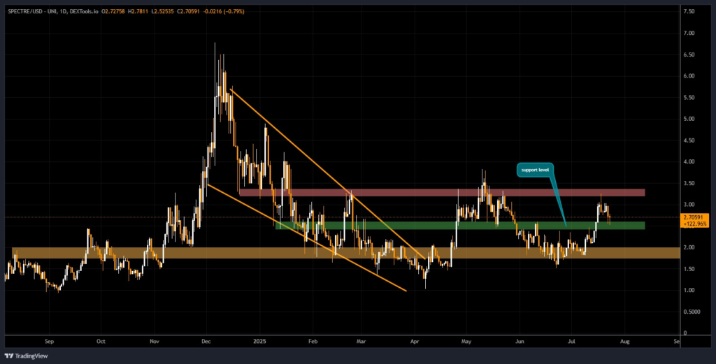 After rallying to a recent high of $0.069, the $SPECT token has retraced to test the $0.062–$0.063 region, which previously acted as resistance in early July. This zone has now flipped into strong support, as evidenced by price stabilizing over the past 48 hours.