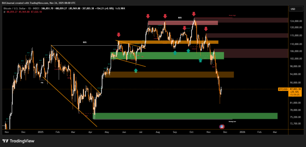 This wave of redemptions emerged alongside one of the most notable price corrections in the current cycle. Bitcoin slid from near $95,600 earlier in the week to around $82,200 on Friday, before recovering modestly to the mid-$87,000 range. Analysts say the rebound is encouraging but warn the broader structure remains unstable.