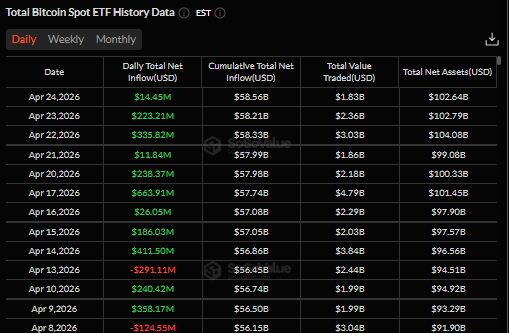 The largest single day inflow occurred on April 17, when funds added about $663.91 million. Other strong sessions included April 14 with $411.50 million and April 22 with $335.82 million in net inflows. The weakest day of the period came on April 24, which recorded a smaller but still positive inflow of $14.45 million.