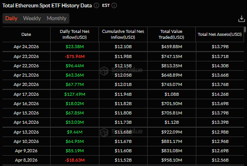 However, the streak ended on April 23 when Ether ETFs recorded net outflows of $75.94 million, signaling a temporary pause in investor momentum while broader crypto market trends continue to evolve.