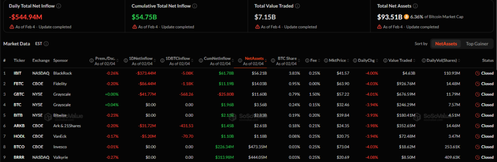 The U.S. spot bitcoin ETF market recorded another sharp reversal, with investors pulling nearly $545 million in a single day as bitcoin prices continued to slide and risk appetite weakened across global markets.