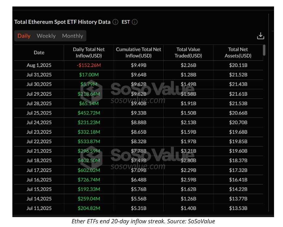 At the same time, Ether ETFs experienced $152.26 million in outflows, effectively ending their longest-ever 20-day inflow streak. The pullback reduced total Ether ETF assets under management to $20.11 billion, or 4.7% of ETH’s total market cap.