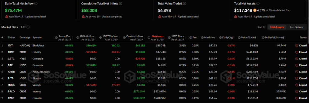 Data from SoSoValue shows that the total net inflows across bitcoin ETFs reached $75.47 million, with BlackRock’s IBIT fund attracting $60.61 million, following a record $523 million outflow the previous day. Grayscale’s Mini Bitcoin Trust also received $53.84 million in net inflows.