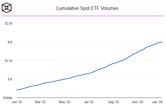 Spot crypto ETFs crossed the $2 trillion cumulative volume mark on January 2, less than two years after their initial launch in January 2024. Notably, it took roughly 16 months to reach the first $1 trillion, but only eight additional months to double that figure, signaling a sharp increase in trading activity and liquidity.